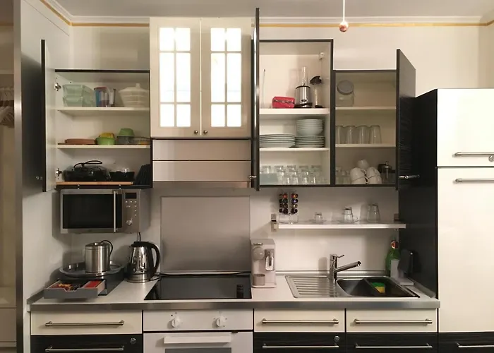 Im Apartment gibt es außerdem eine Küchenzeile, die mit einem großen Kühlschrank und einem Kochfeld ausgestattet ist.